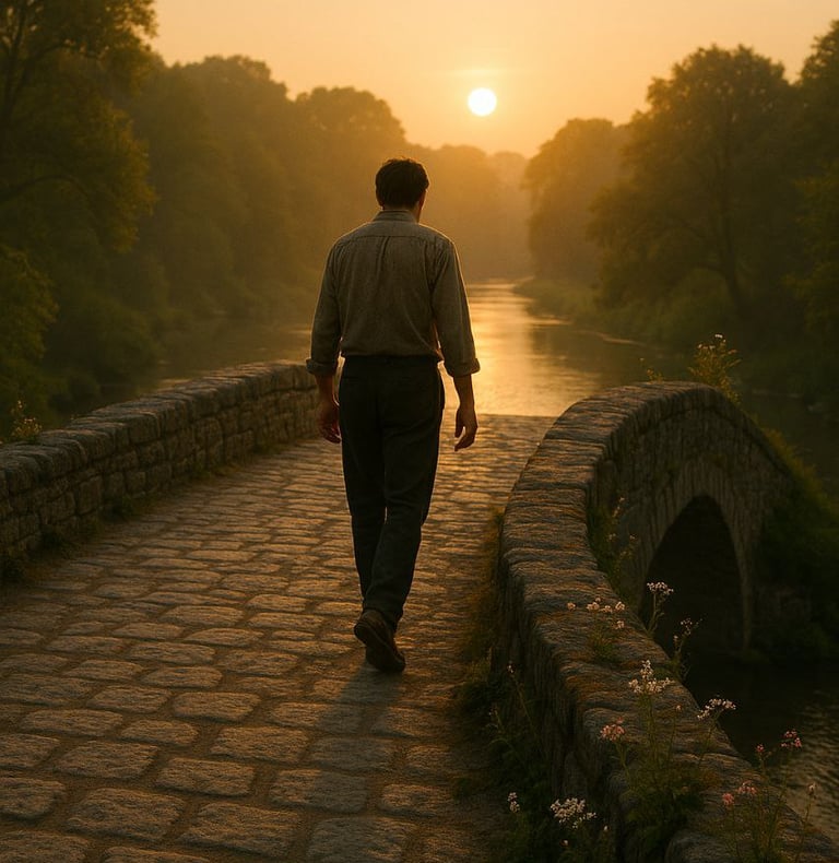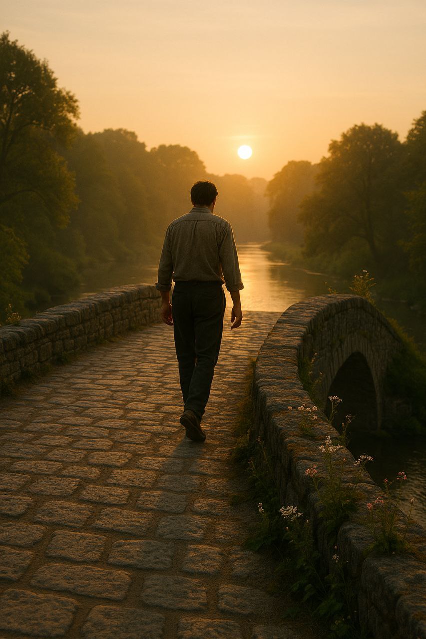 Ele ficou ali por um longo tempo, apenas ouvindo a água. Depois começou a atravessar a ponte, e cada passo parecia diferente. Ele já não estava mais desesperado; algo dentro dele havia mudado. As preocupações não tinham desaparecido — ainda havia incerteza sobre o trabalho, e a comida do próximo mês ainda era uma dúvida — mas uma nova calma havia brotado em seu coração. Quando chegou ao outro lado, não olhou para trás.