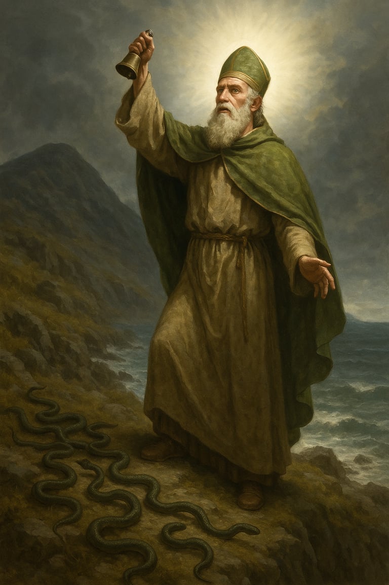 Patrick climbed a mountain, fasted 40 days, and struck his bell, commanding the snakes and demons to leave Ireland.