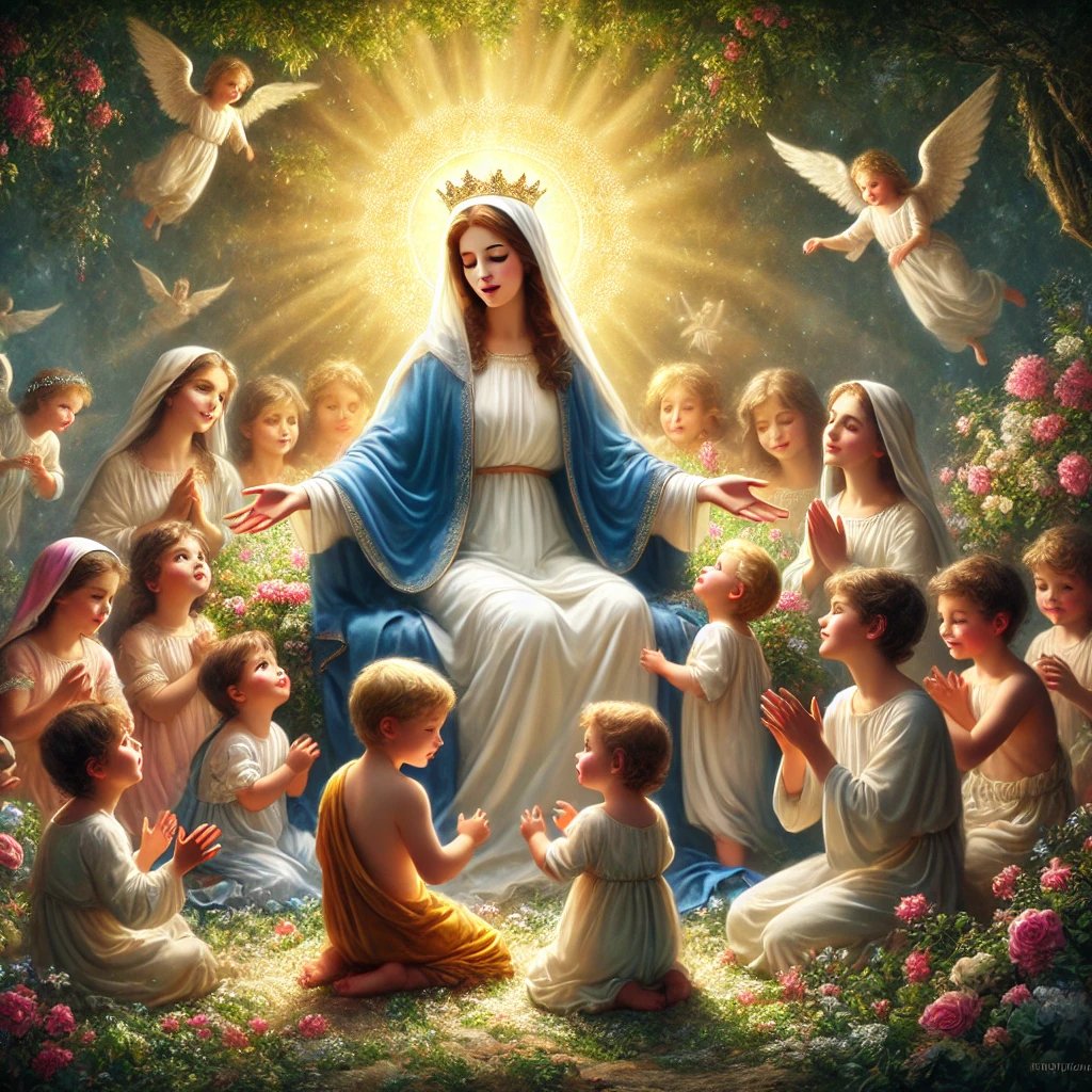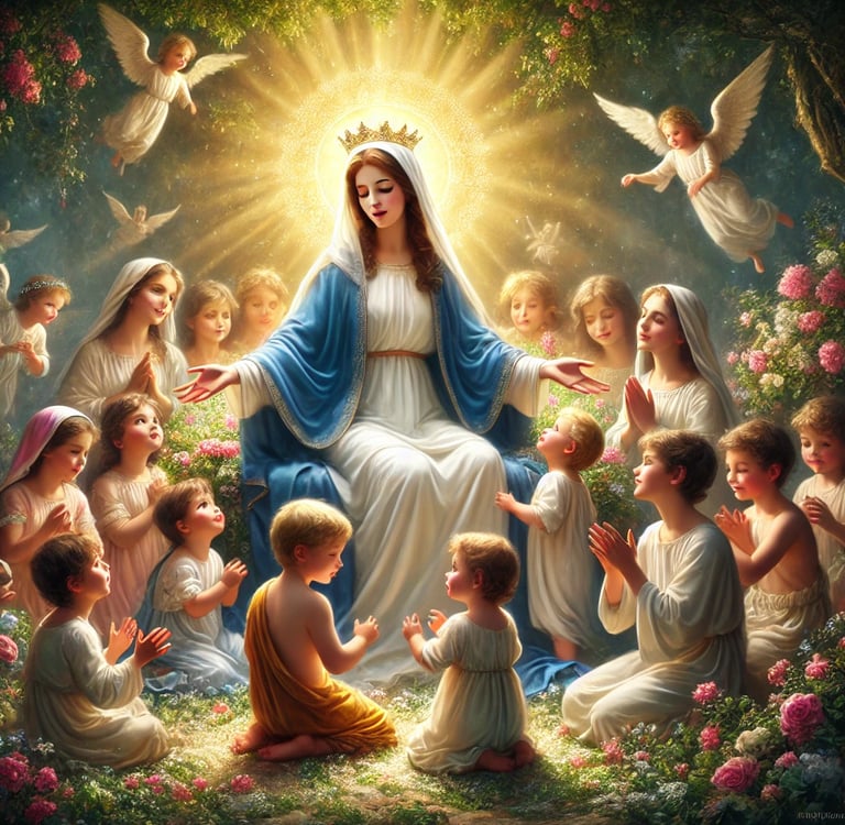 One evening, as the sun dipped below the horizon and bathed the garden in golden light, Maria felt a presence. She looked up to see a vision of the Virgin Mary surrounded by children, her hands outstretched in blessing. The children’s faces were radiant, filled with joy and reverence. A soft voice spoke to Maria’s heart: "Do not be afraid, dear child. Your faith has reached Heaven. Trust in the love of my Son, Jesus