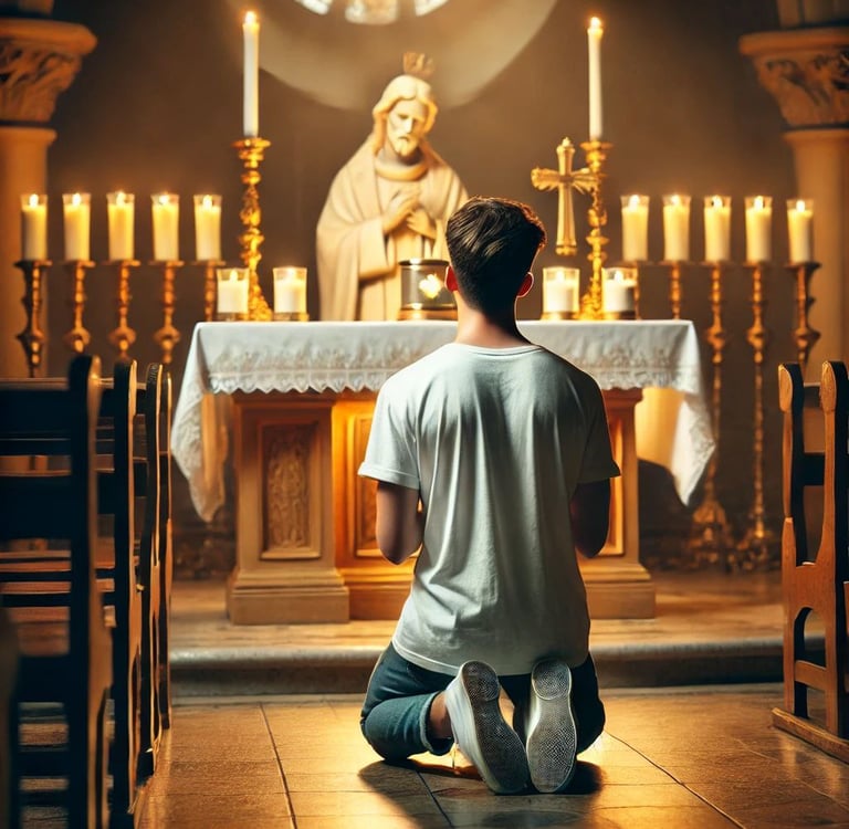"Mãe Maria, não tenho mais a quem recorrer," ele sussurrou, com lágrimas escorrendo pelo rosto. "Minha tia me trata como um escravo. Ela roubou tudo o que meu pai me deixou. Não tenho nada. Por favor, interceda por mim!"