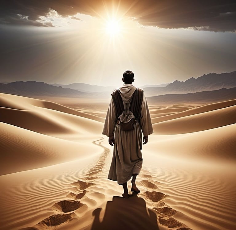 Um viajante chamado Elias viajou por um vasto deserto com a tarefa de entregar uma mensagem urgente a uma aldeia distante. O caminho não era familiar, mas Elias confiava que Deus o guiaria. Durante dias, a viagem correu bem, mas uma repentina tempestade de areia mudou tudo. Seu mapa foi perdido e ele vagou sem rumo.