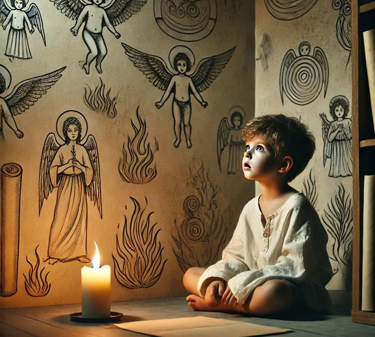 Every morning, his papers were filled with strange images—flames, scrolls, angels with unreadable names, and shapes that resembled temple doors. He drew heaven, or something close to it, although no one taught him such things. One day, he drew a figure with eyes of fire and a sword from His mouth.