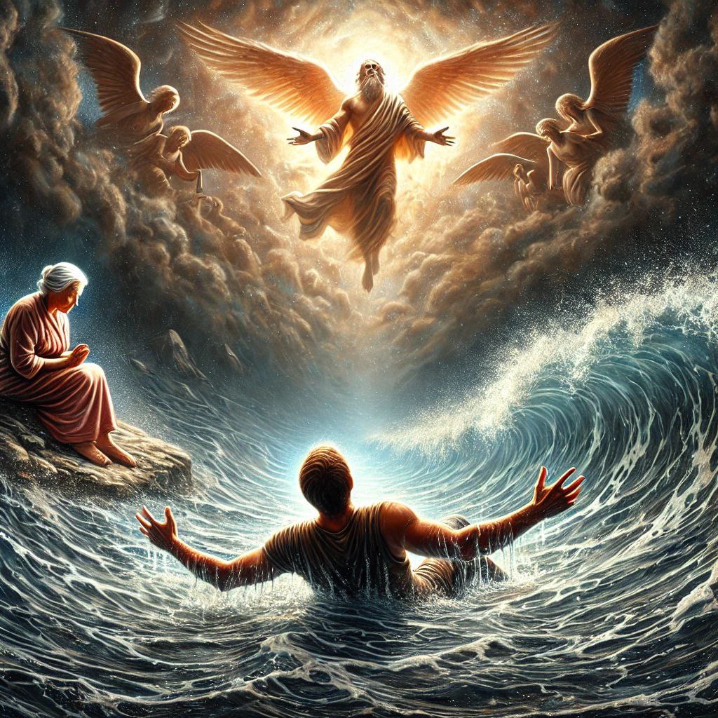 Then, just as the darkness seemed to consume him, a soft glow appeared in the distance. He turned his head and saw his grandmother kneeling on the shore, praying fervently. Her face was peaceful, but her hands were clenched as though she were in a battle.